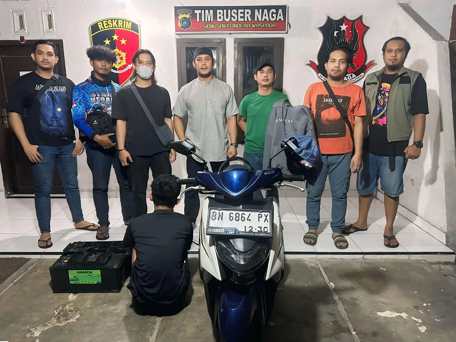 Polisi turut mengamankan sejumlah barang bukti, di antaranya satu unit sepeda motor Yamaha Gear warna putih, dua buah aki merek Amaron, serta satu helai hoodie warna abu-abu bertuliskan “SOMEDAY”.