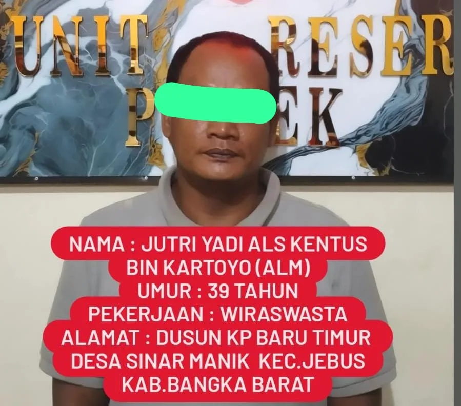 Terduga pelaku diketahui bernama Jutri Yadi alias Kentus bin Kartoyo (alm) warga dusun kampung Baru Timur Desa sinar manik kecamatan Jebus kab.Bangka Barat, yang ditangkap pada Kamis, 21 Agustus 2025 sekira pukul 01.00 WIB di Desa Bakam, Kecamatan Bakam, Kabupaten Bangka.